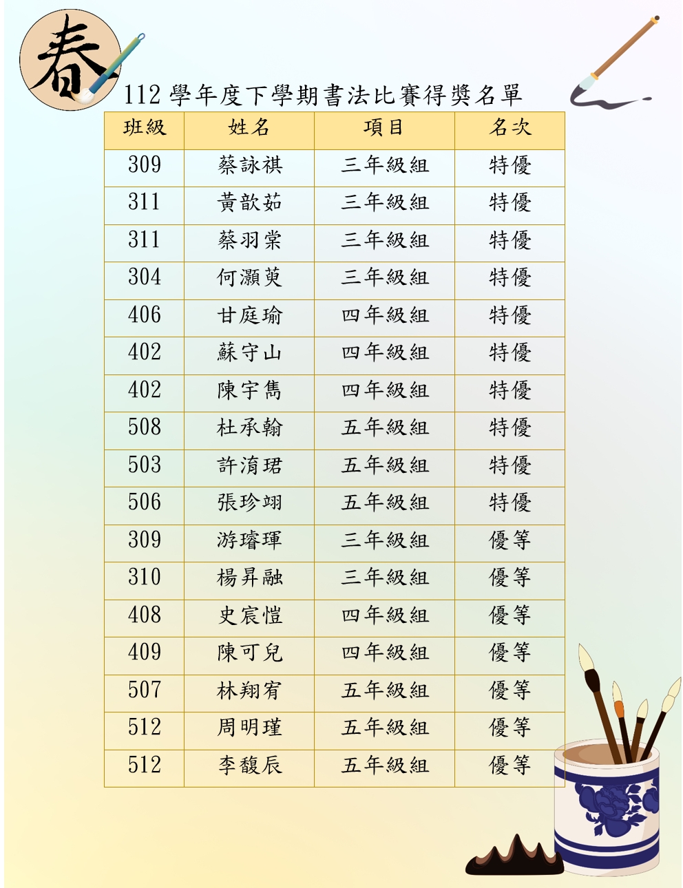 🎉🎉112學年度永福國小第2學期投稿寫作、繪畫、書法大賽得獎名單