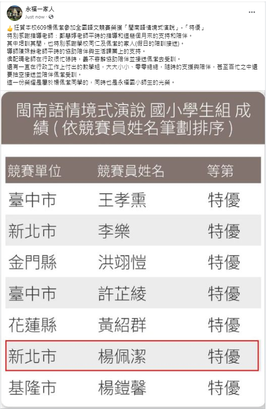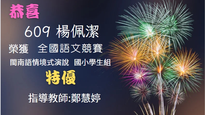 狂賀本校609楊佩潔參加全國語文競賽榮獲「閩南語情境式演說」「特優」