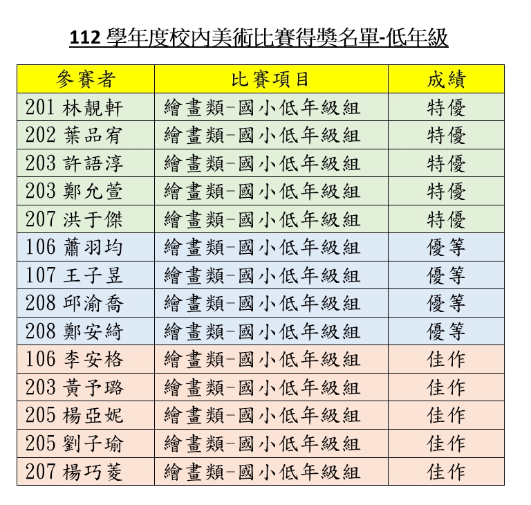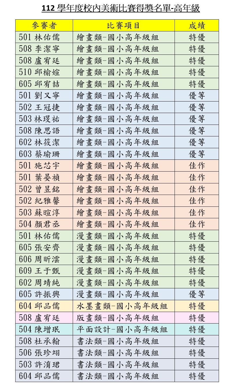 112學年度校內美術比賽得獎名單